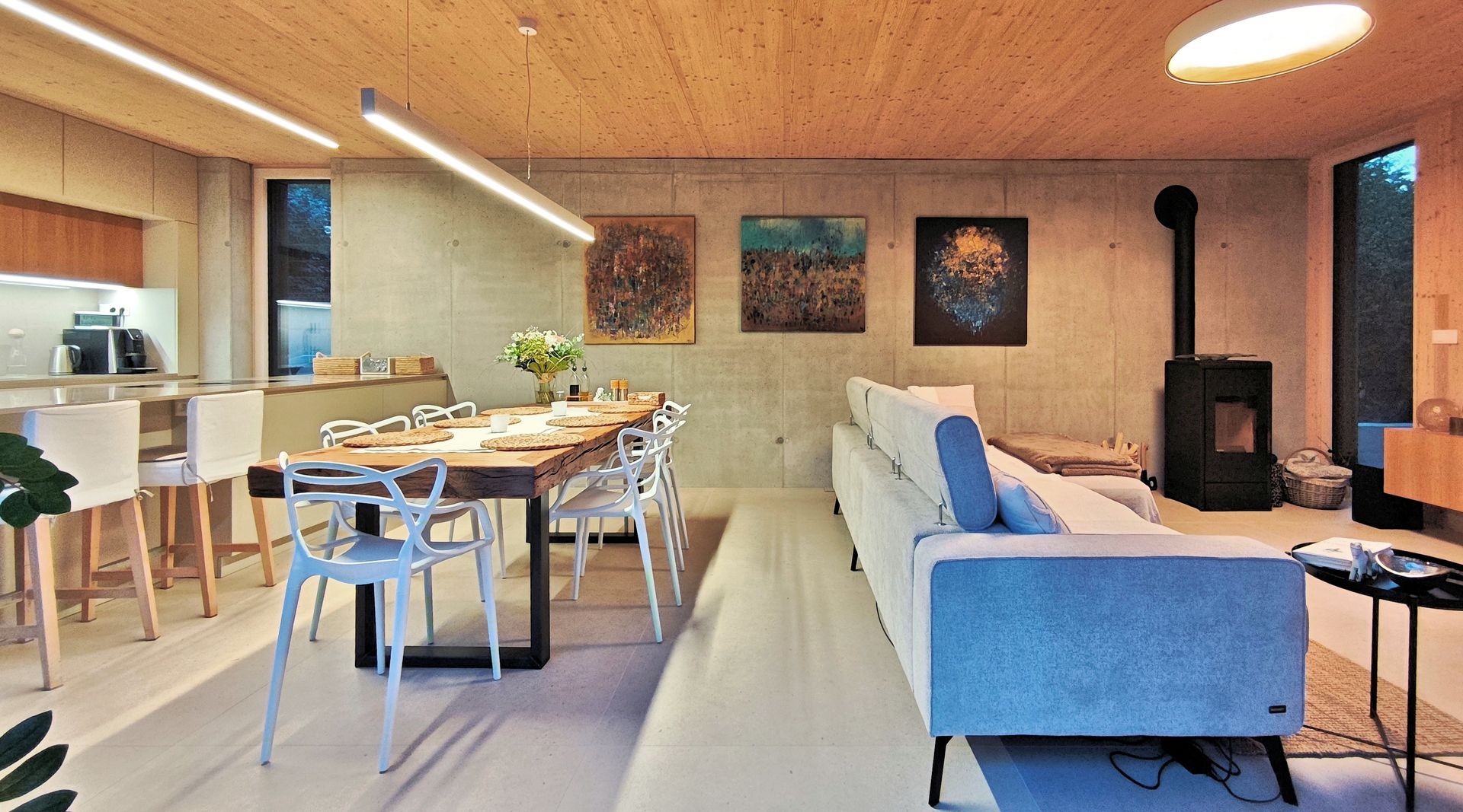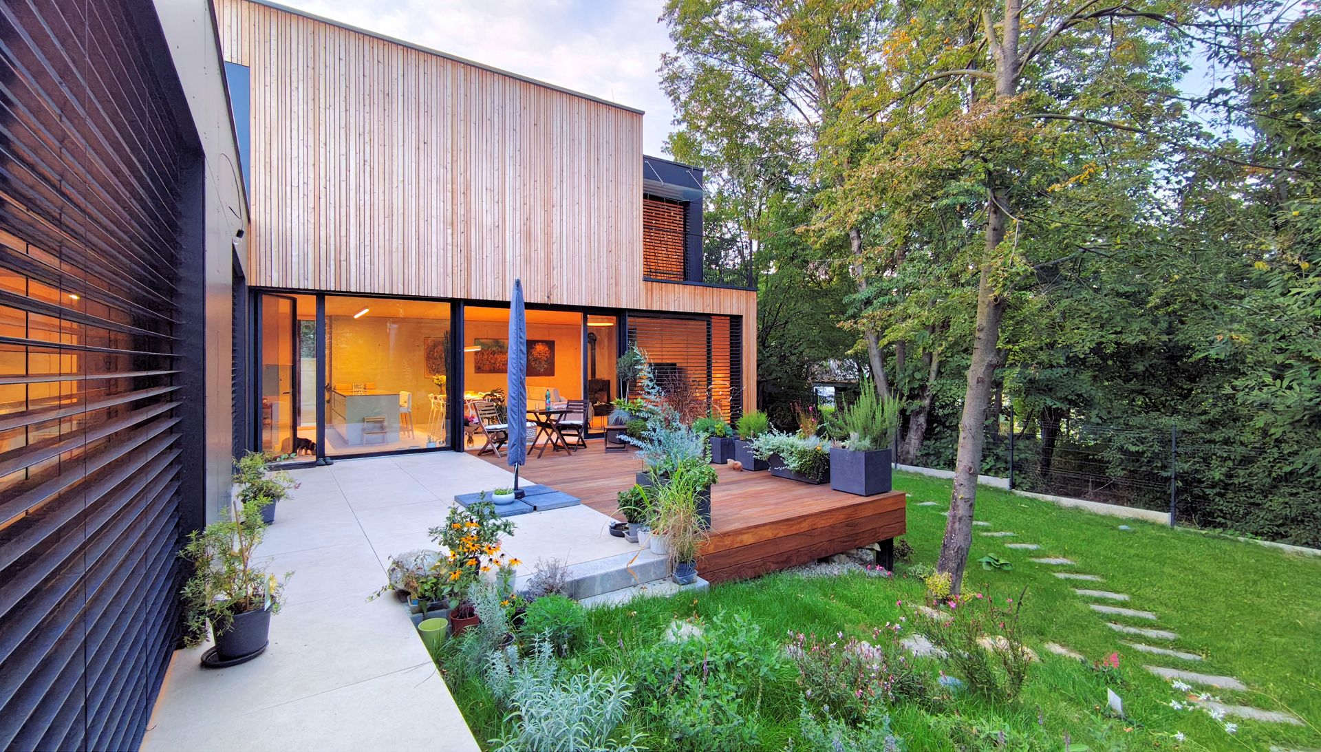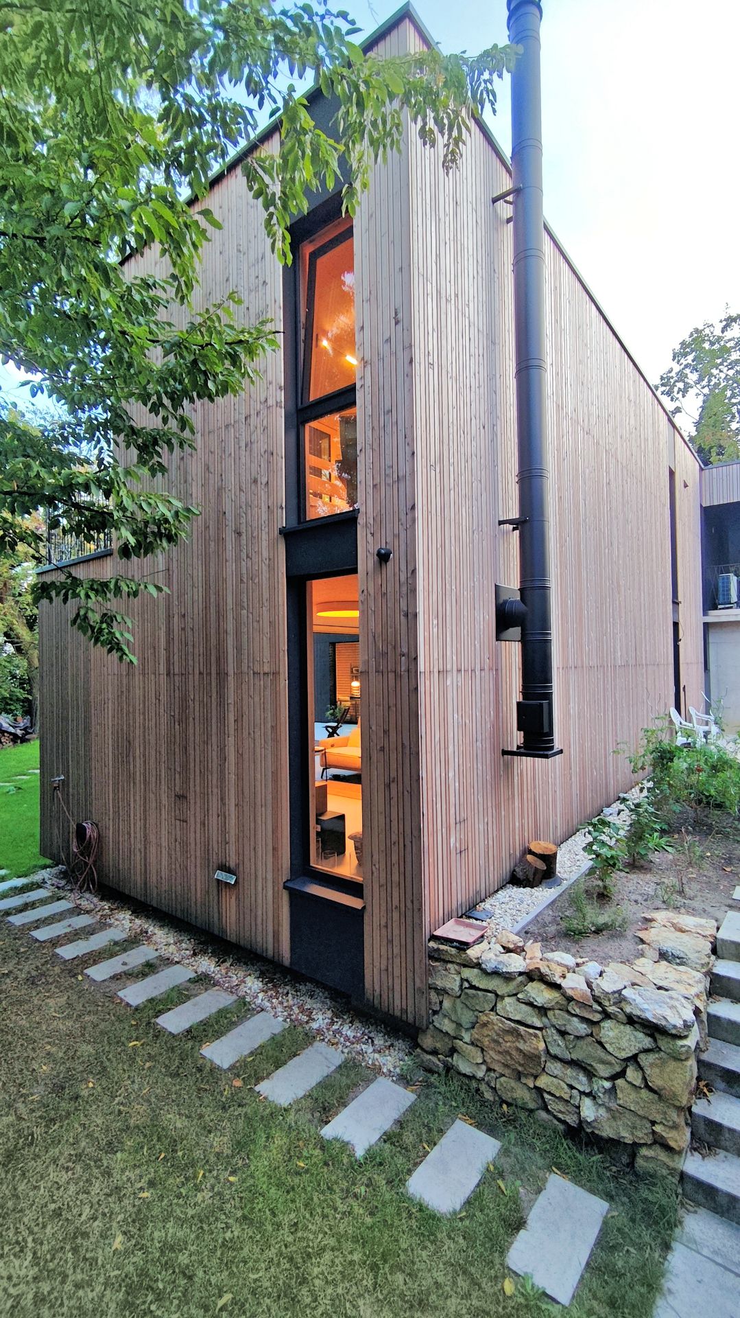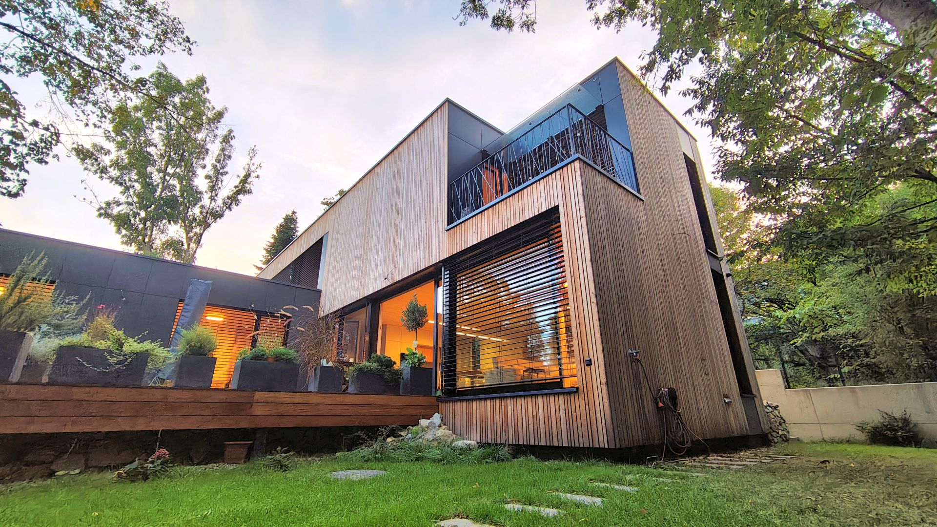Rodinný dom je navrhnutý pre 4 člennú rodinu. Stavba je z CLT panelov, vonkajšia fasáda zo sibírskeho smrekovca. Stavba je čiastočne zapustená vo svahu, suterén je železobetonovej konštrukcie. Terasa je orientovaná do záhrady a je prístupná zo všetkých obytných miestností. Návrh pochádza z architektonickej dielne Molnár-Peráček.