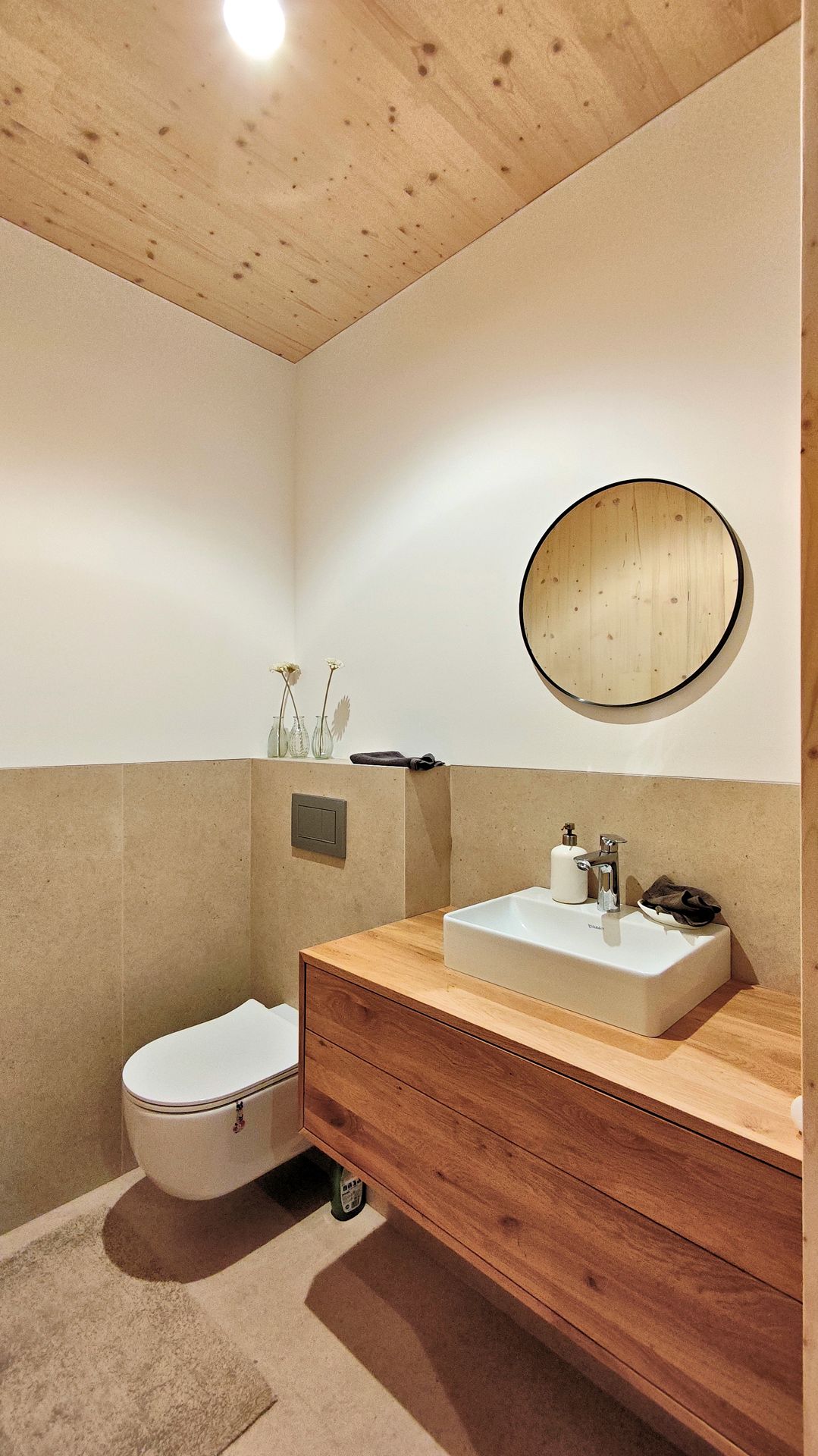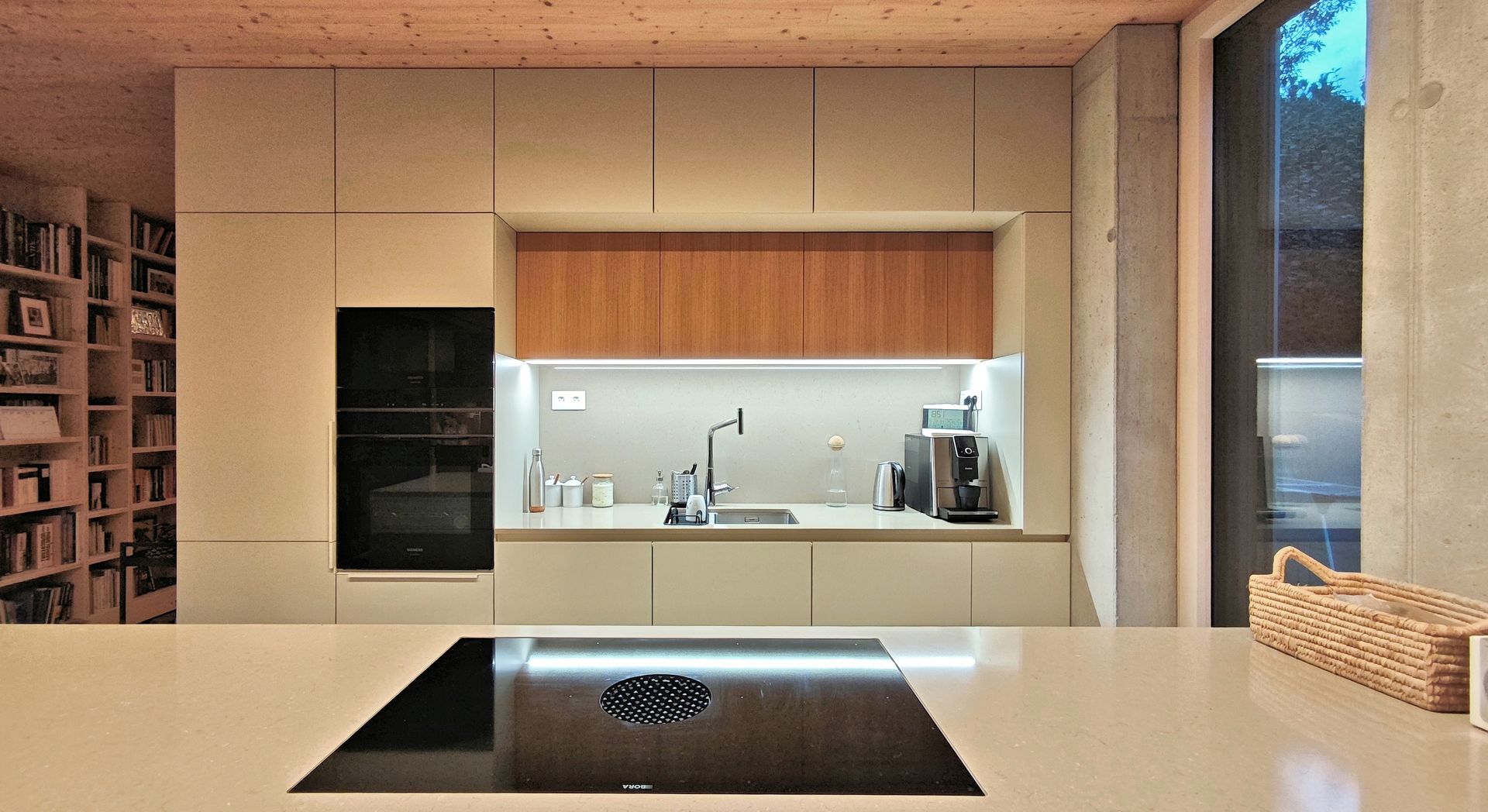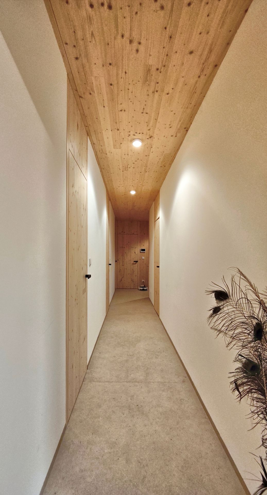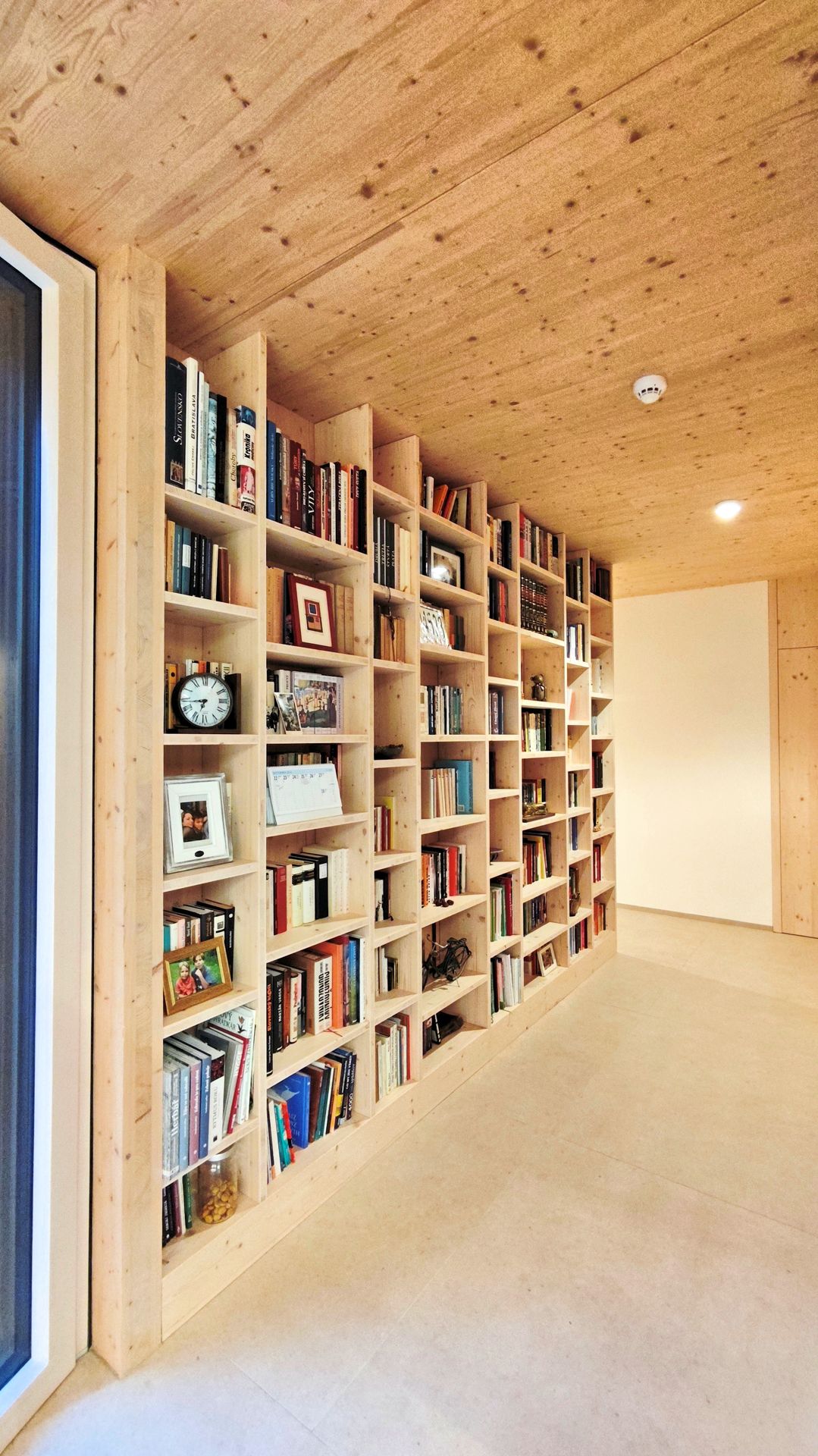 Rodinný dom je navrhnutý pre 4 člennú rodinu. Stavba je z CLT panelov, vonkajšia fasáda zo sibírskeho smrekovca. Stavba je čiastočne zapustená vo svahu, suterén je železobetonovej konštrukcie. Terasa je orientovaná do záhrady a je prístupná zo všetkých obytných miestností. Návrh pochádza z architektonickej dielne Molnár-Peráček.
